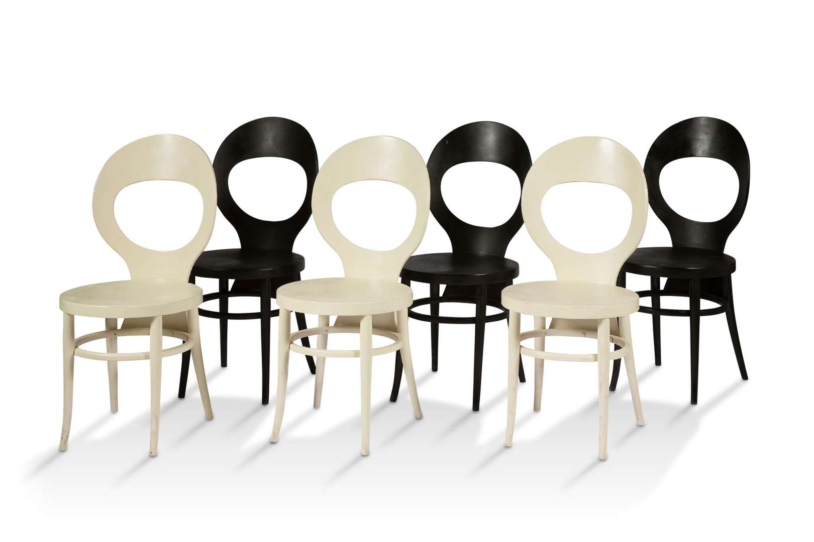 En bois courbé et contreplaqué, laqué noir pour trois d'entre elles et laqué blanc pour les tois autres.