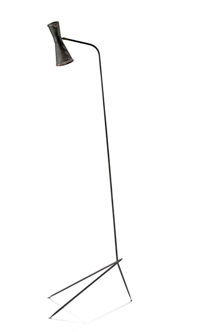 Structure en métal tubulaire laqué noir, reposant sur un piètement tripode, abat-jour diabolo en tôle de métal perforée laqué noir (ajouté postérieurement).