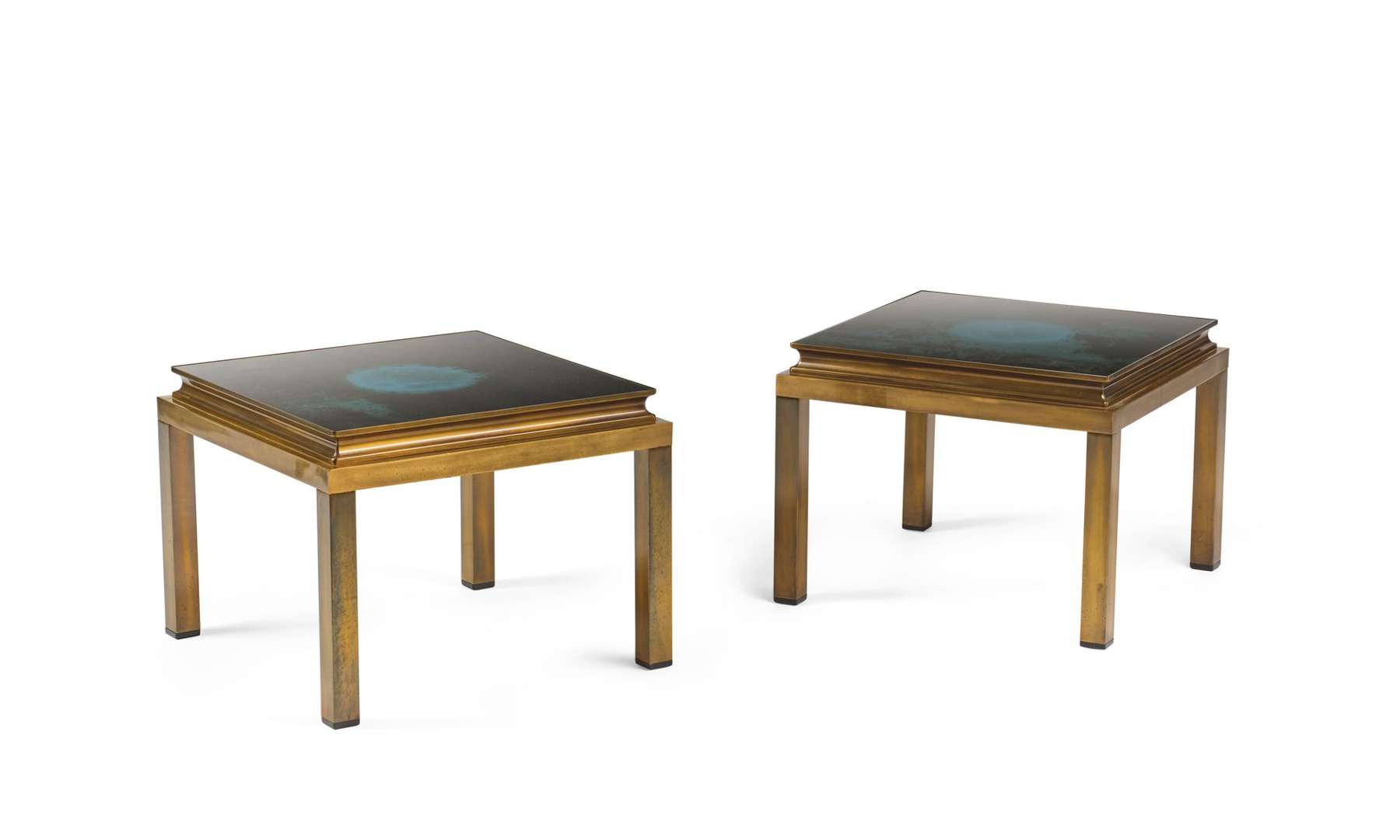 Structure en laiton verni, soutenant un plateau carré en verre églomisé à décor dit d' "éruption solaire".