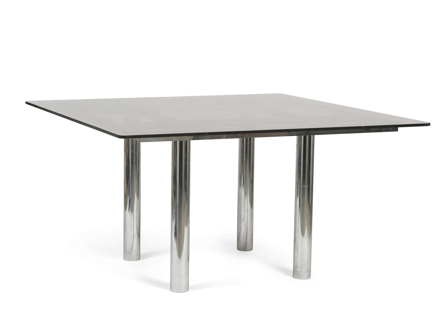 A square table, "André" model designed in 1963, chromed metal structure, smoked glass top.