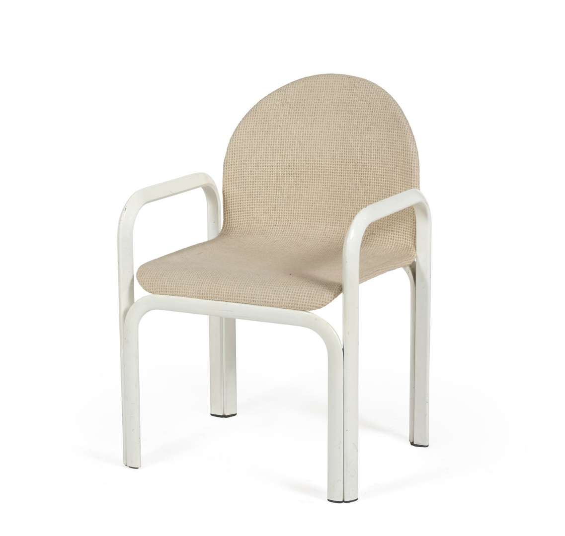 Structure en métal laqué blanc, garniture postérieure de lainage beige.