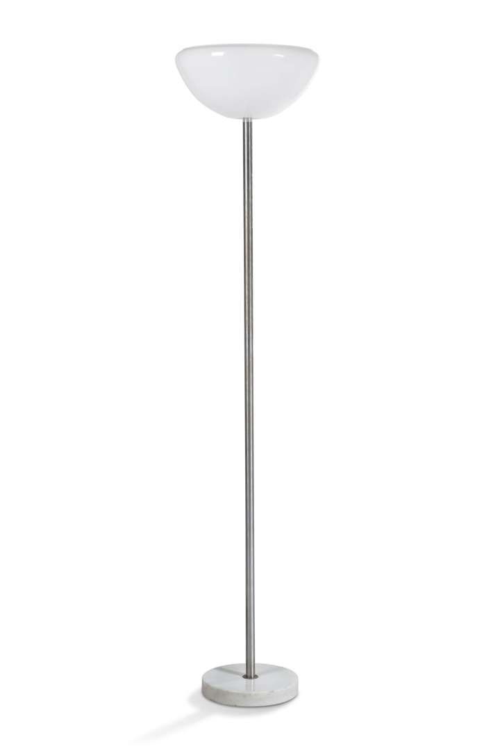 Réflecteur circulaire en verre opalin, reposant sur un fût tubulaire en métal chromé, se terminant par une base circulaire en marbre.