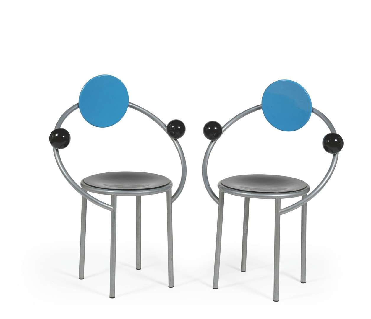 Structure en métal tubulaire laqué gris, assise et dossier circulaires en bois laqué noir et bleu, accotoirs sphériques en bois laqué noir.