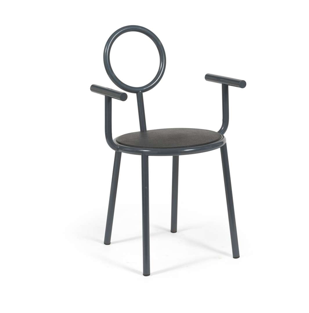 Structure en métal tubulaire laqué gris, assise circulaire en PVC noir.