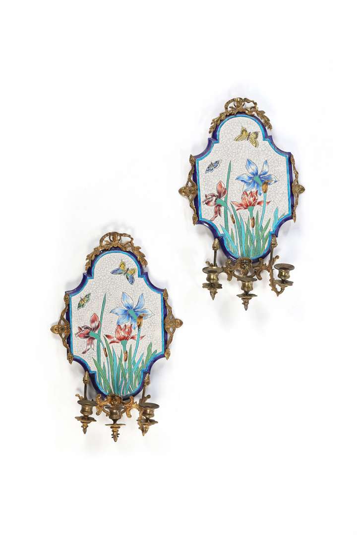 Plaque en faïence émaillée, à décor polychrome d'iris et de papillons sur fonc blanc craquelé, monture en bronze doré accueillant trois bras de lumière en partie basse.
