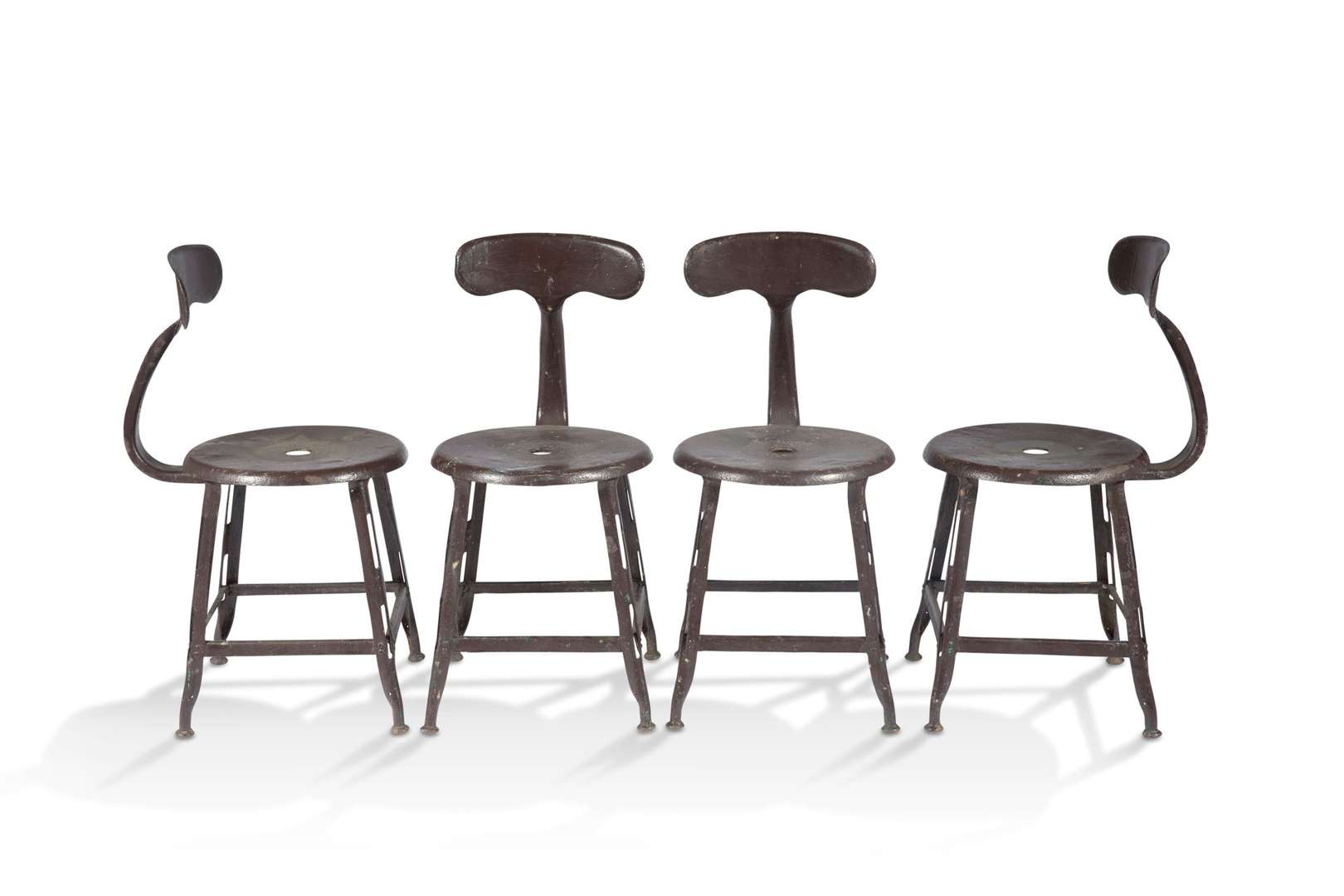En métal laqué marron, le dossier en queue de baleine, reposant sur un piètement quadripode à entretoises.