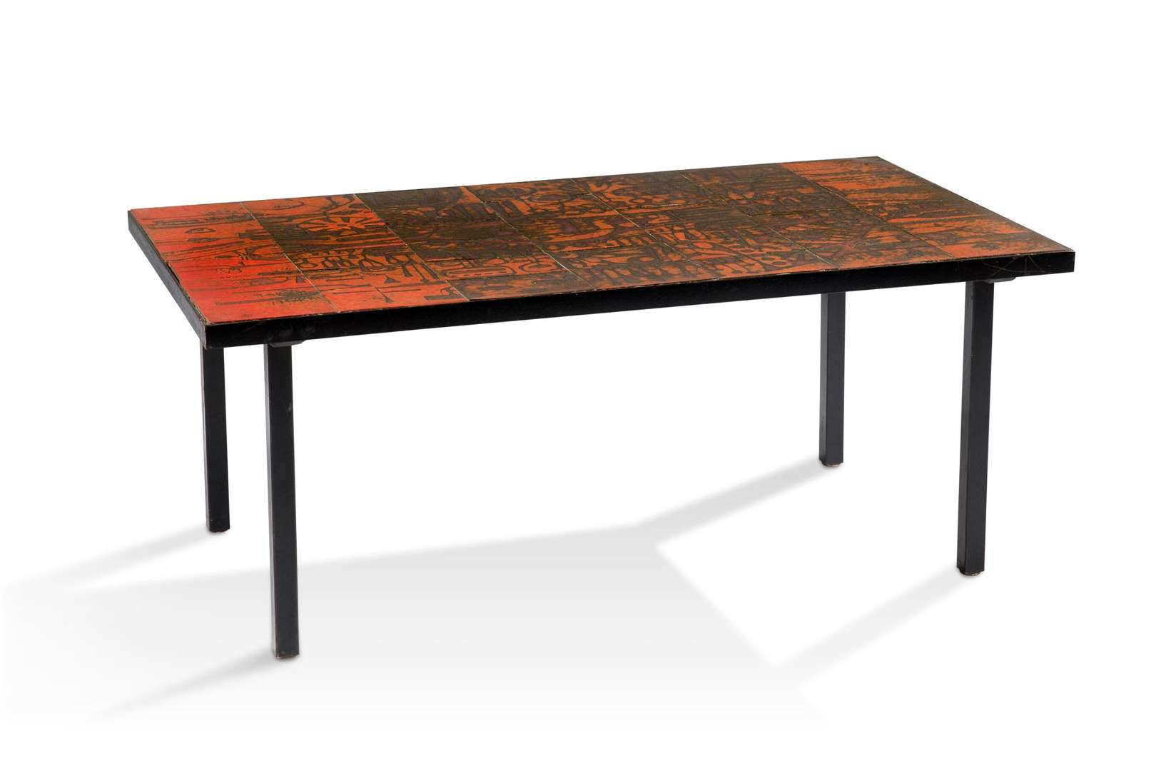 Plateau rectangulaire orné de carreaux de céramique émaillée rouge et brun, reposant sur un piètement en fer forgé.