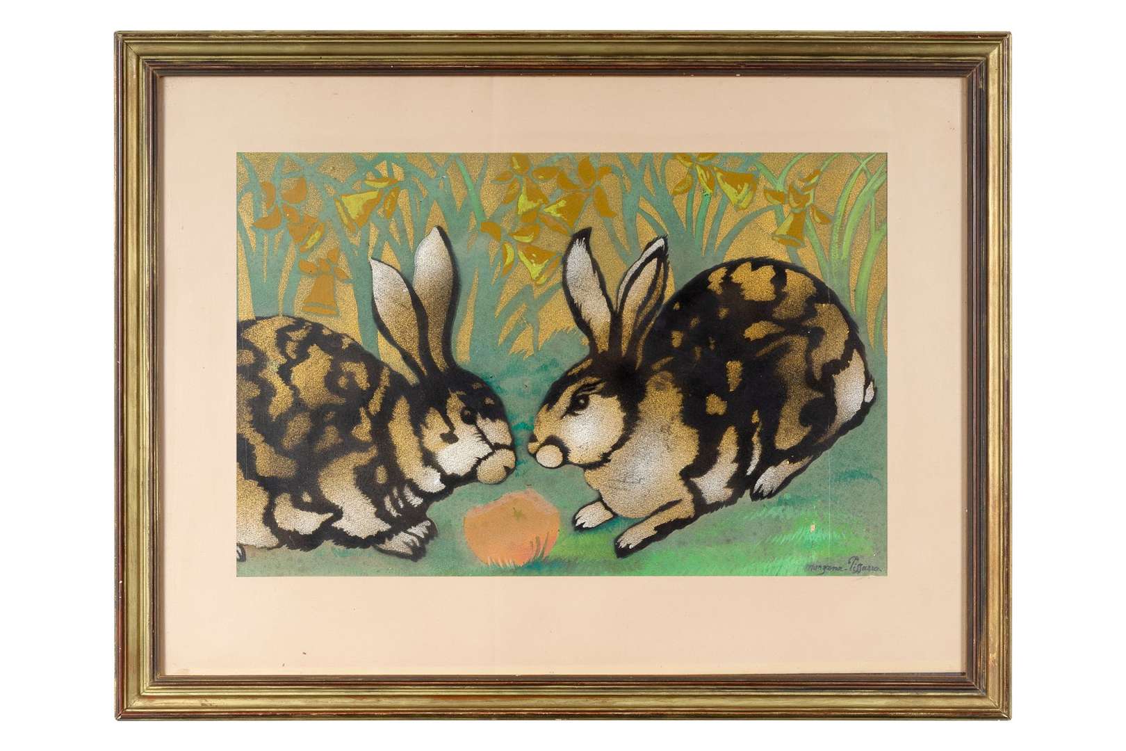 Pochoir en couleurs rehaussé d'encre bronze et argent sur papier épais teinté