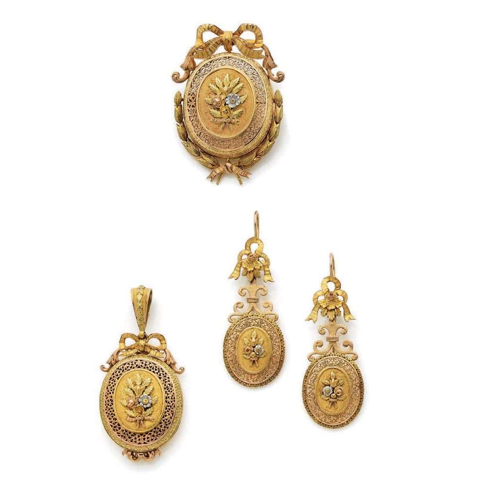 Pendentif à secret, paire de pendants d'oreilles et broche
