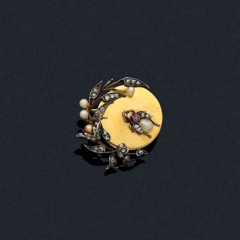 A natural pearl (not tested), diamond, sapphire, gold and silver brooch