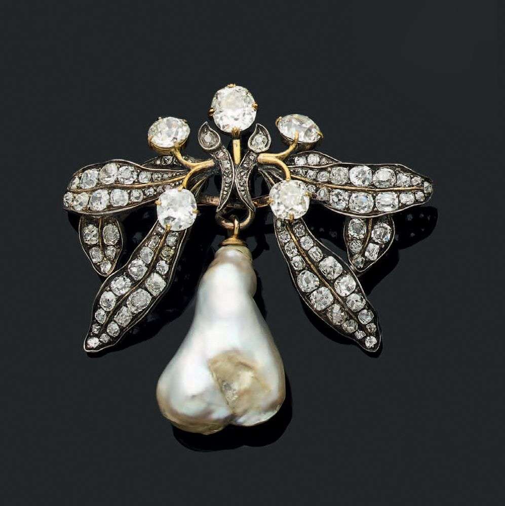 Diamants coussins et ronds taille ancienne, perle fine baroque