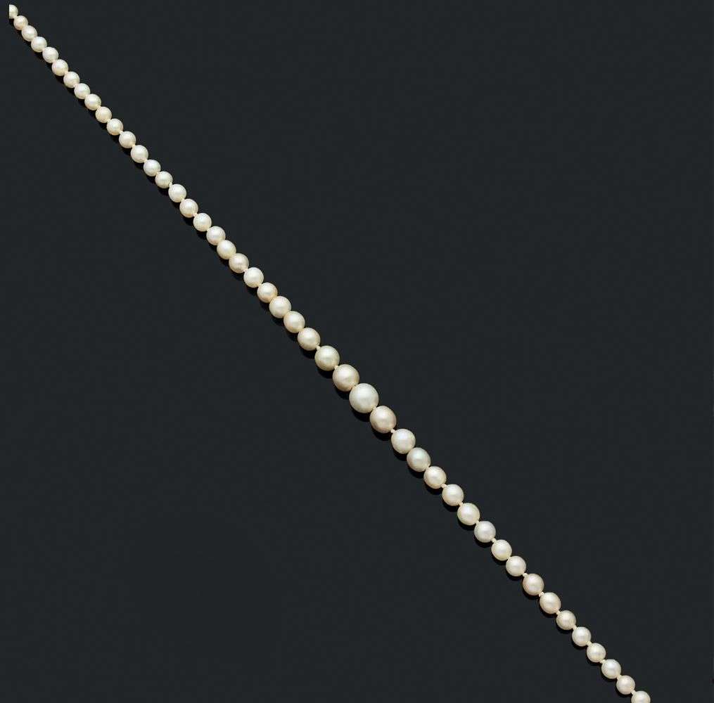 Rang de 85 perles fines en chute et 1 perle de culture