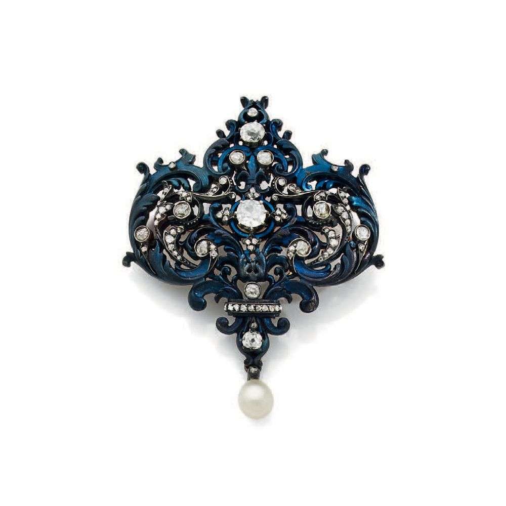 Émail bleu, diamants taille rose et taille ancienne, perle supposée fine, non testée, en pampille