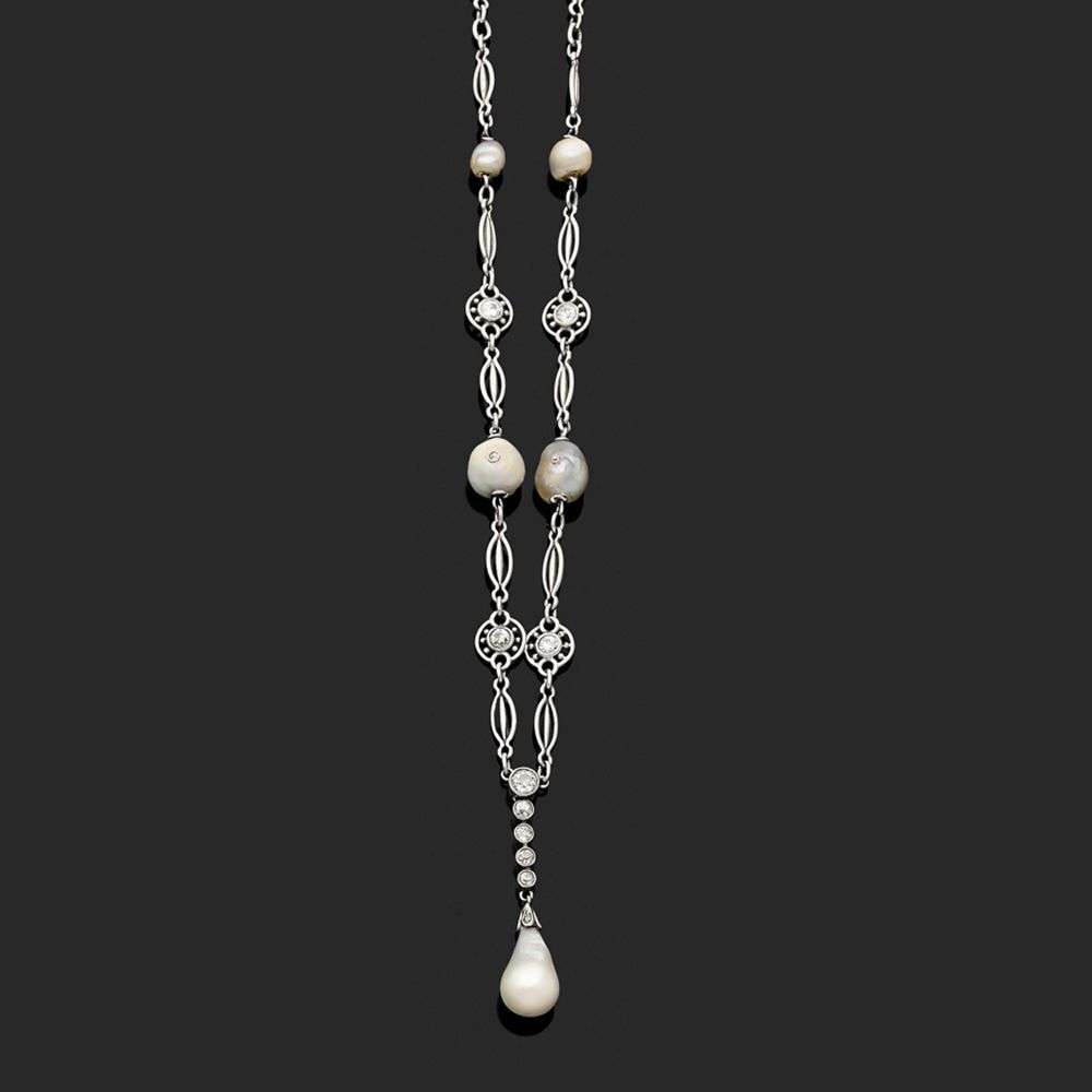 A natural pearl, diamond and gold necklace, report