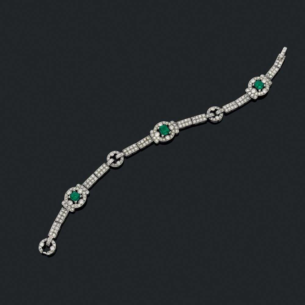 An emerald, diamond and platinum bracelet, signed Cartier, IAJA certificate. Circa 1925