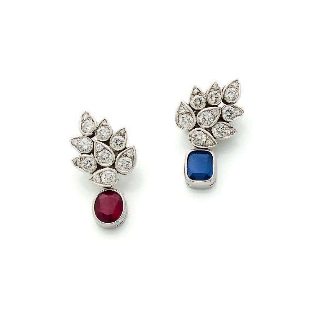 PAIRE DE PENDANTS D'OREILLES Diamants taille brillant, rubis ovale et saph