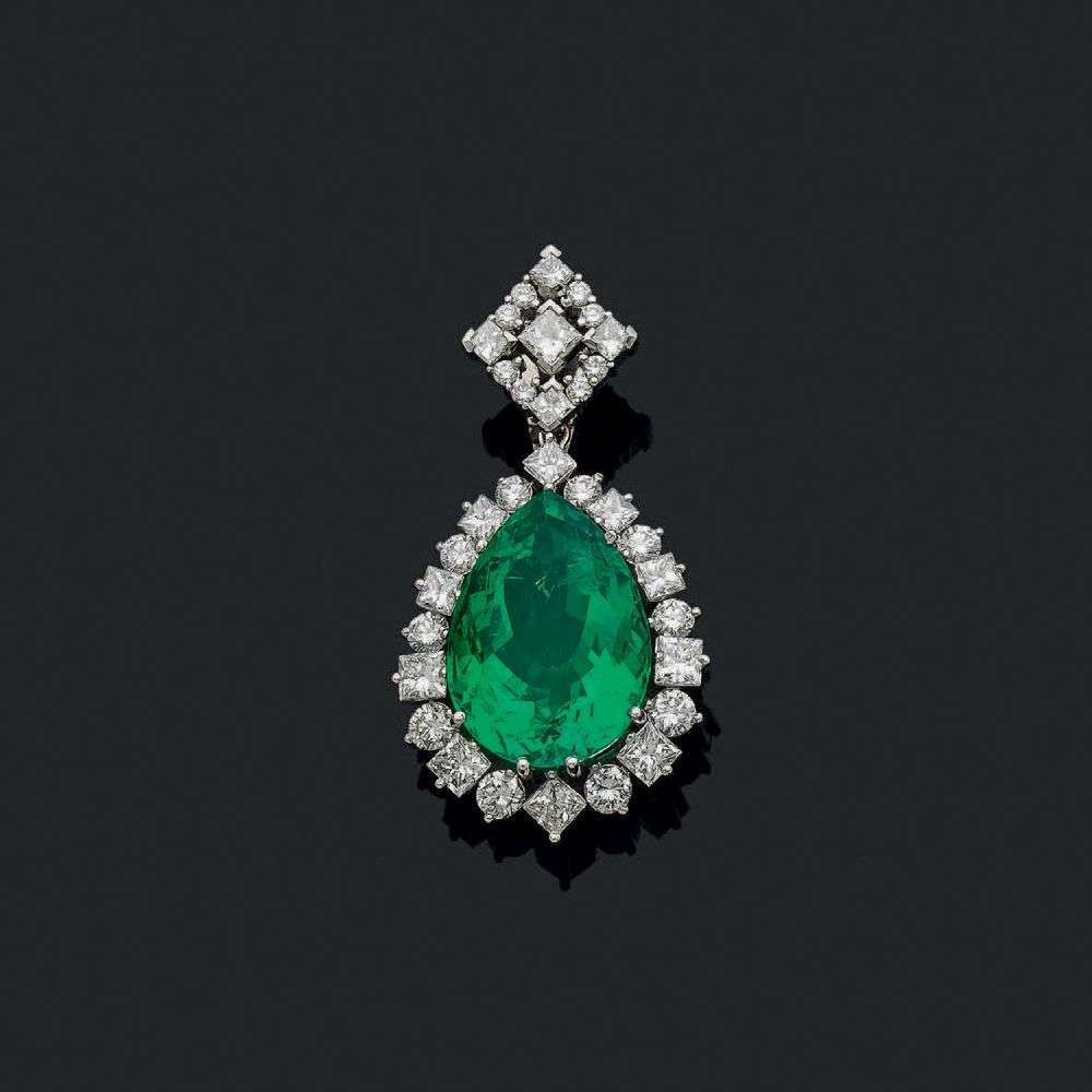 Importante émeraude taille poire, diamants princesses et ronds taille brillant