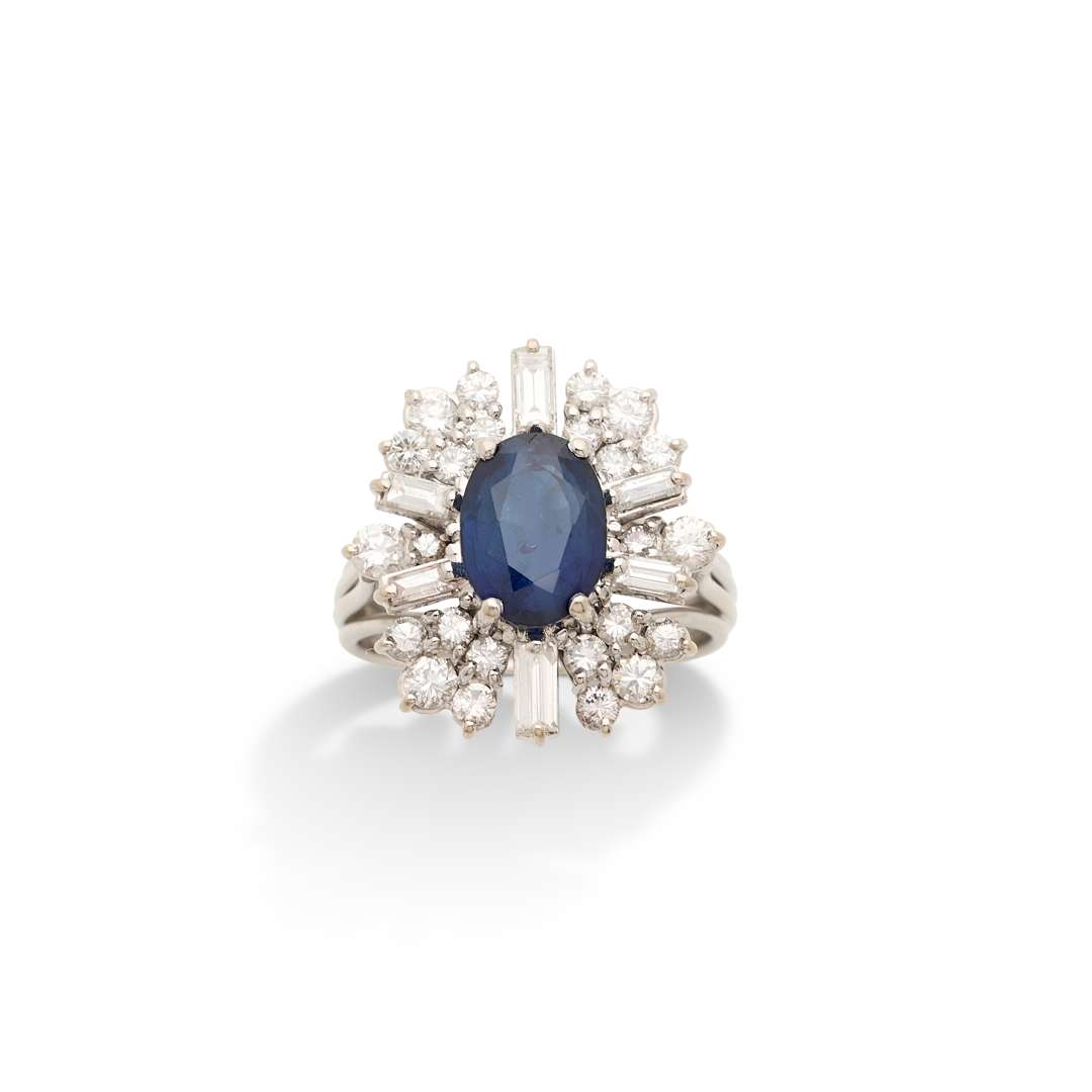 Saphir ovale, diamants baguettes et diamants ronds taille brillant