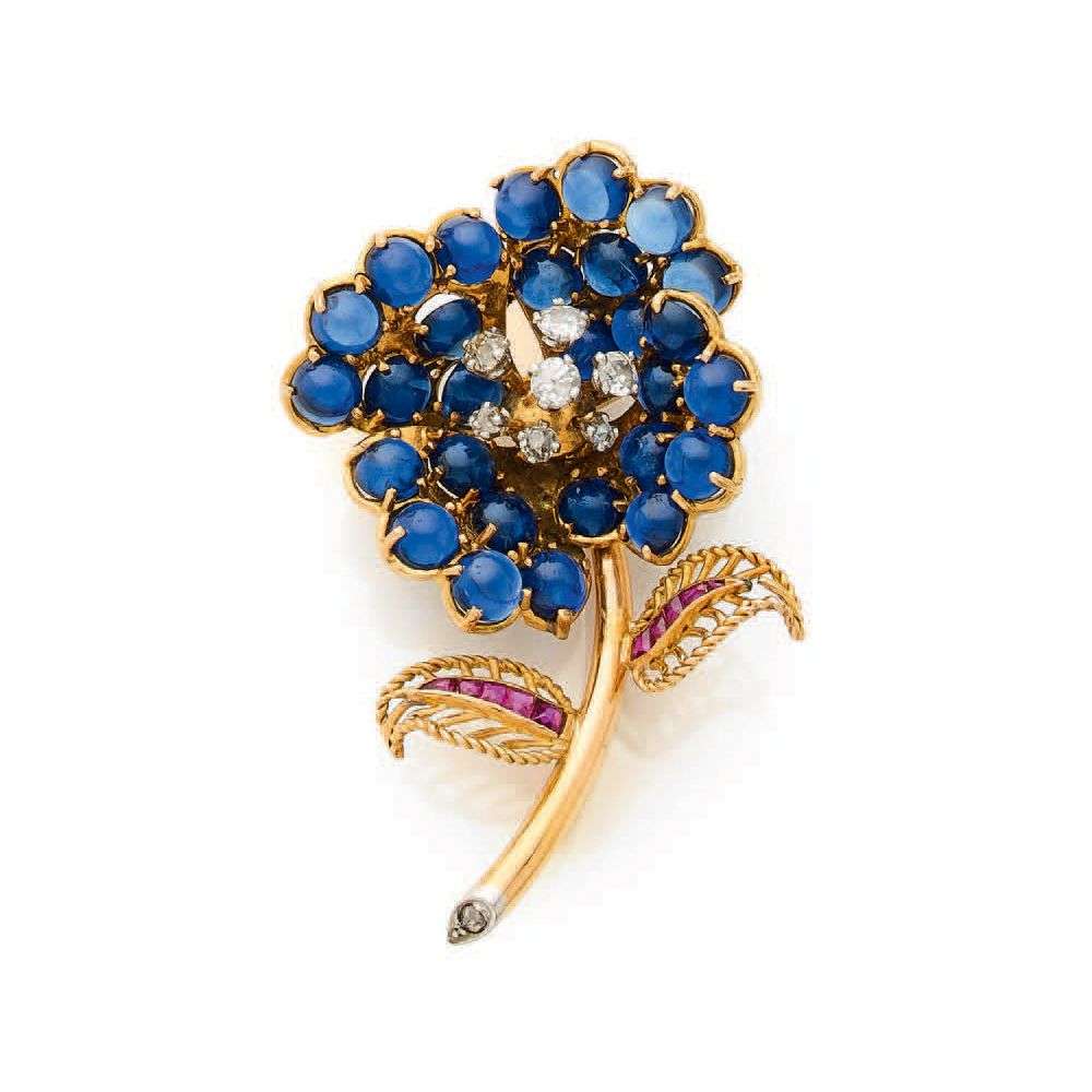 Cabochons de saphir, rubis calibrés et diamants taille ancienne