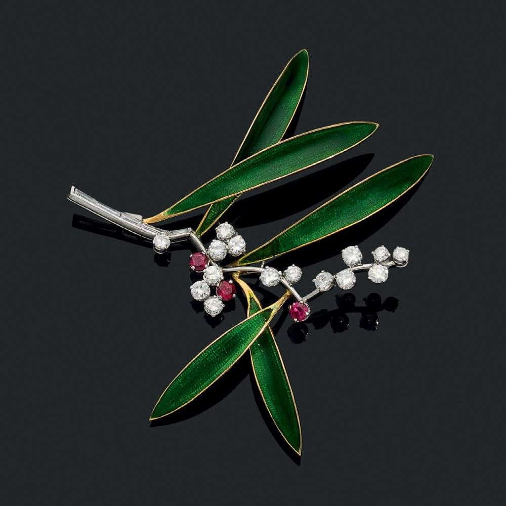 An enamel, ruby, diamond and gold brooch, signed Boucheron