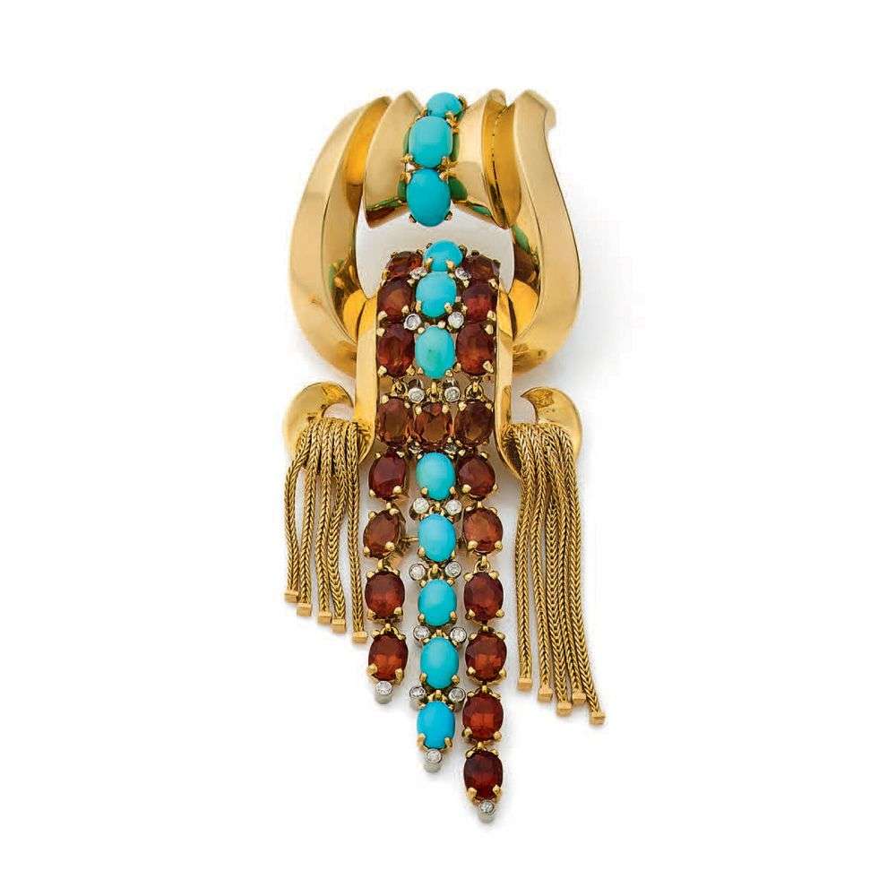 Cabochons de turquoise, citrines, diamants taille ancienne et taille huit-huit