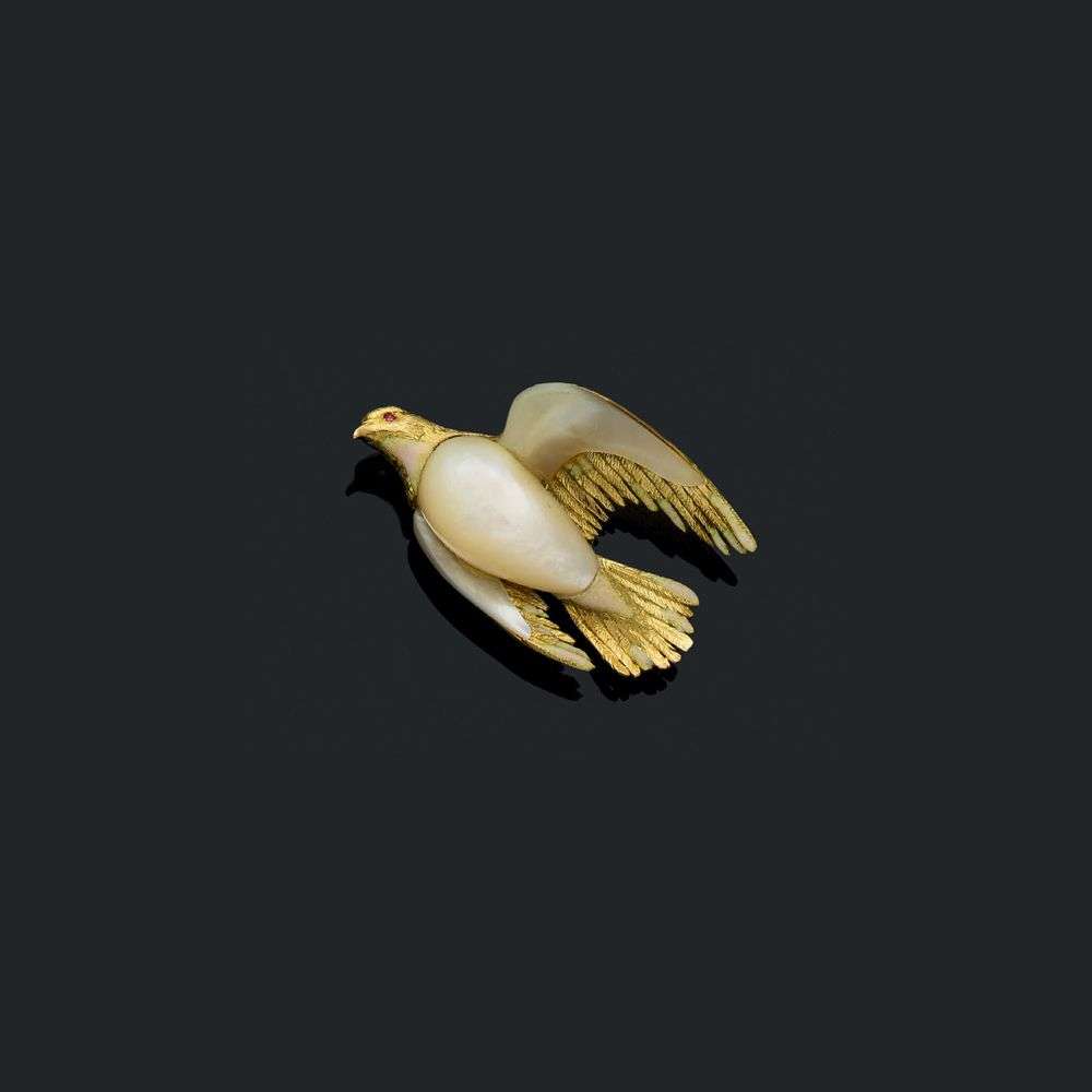 A mother of pearl, enamel, ruby and gold clip, signed Mellerio