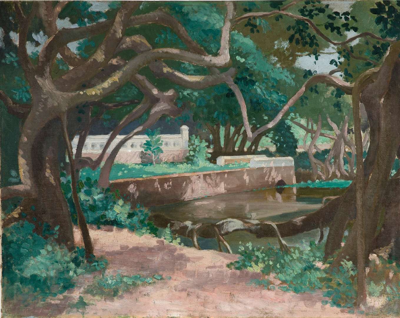 Very few of his works have come down to us, but those we do know share a certain taste and talent for Vietnamese landscapes and architecture. Here, a low wall is sketched in the background, while next to it a pond is surrounded by vegetation. Precise work is carried out on light and shades of green and brown. The artist seems to have fully integrated the lessons of outdoor painting, taught in particular by Joseph Inguimberty, professor at the School of Fine Arts from 1925 to 1945.