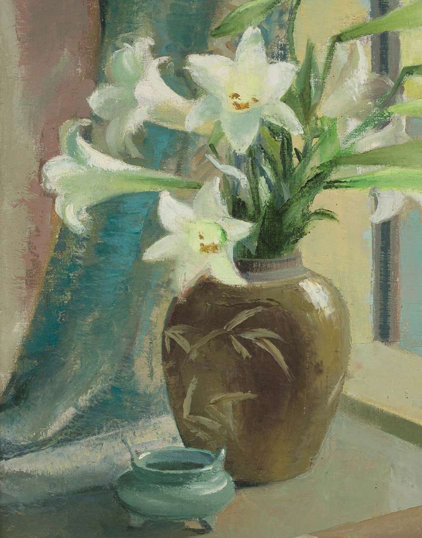 Genre occidental, qui se développe à la Renaissance et qui devient un genre pictural indépendant au XVIIe siècle 2, la nature-morte va intéresser les artistes de l’École des beaux-arts de l’Indochine 3. Ainsi, le sujet principal de cette oeuvre de Lương Xuân Nhị est ce bouquet de lys dans un vase, le tout dans un intérieur à la décoration vietnamienne, baigné d’une lumière douce.