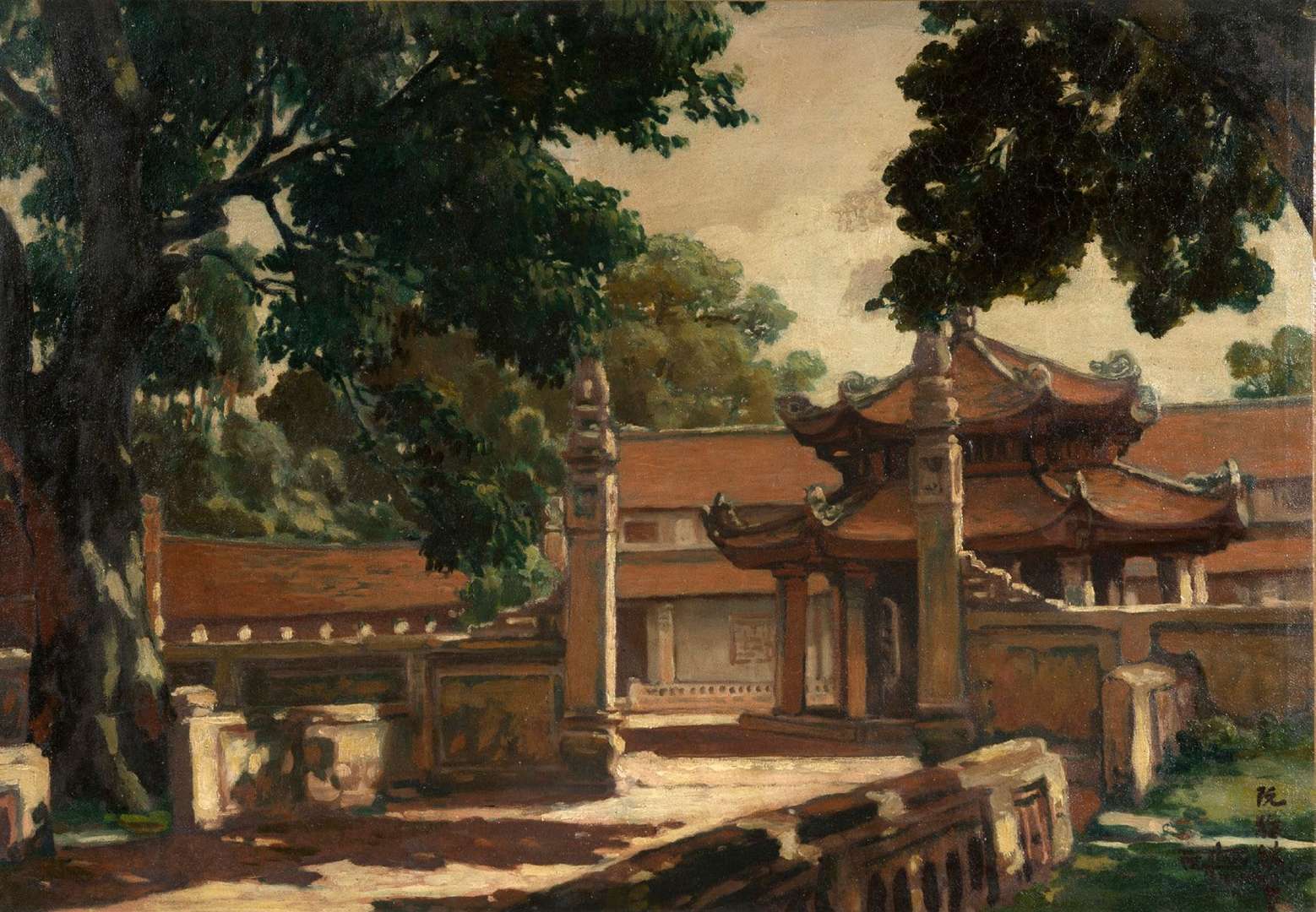 The ensemble presented here is typical of the work of artist Nguyễn Mai Thư, whose style is identifiable with his representations of the Bay of Along, its islands, junks and traditional boats... The pagoda motif is also a recurring subject for this artist, whose biography remains a mystery to this day. Here, it's the entrance to the place that is represented, imbued with light and shadow.