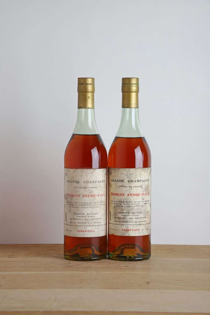 2 B COGNAC GRANDE CHAMPAGNE PREMIER CRU TIERÇON ANDRÉ-PAUL 70 cl 41% (1 à 4,5 et 1 à 5 cm| e.t.h. à e.a| c.c. légères) - NM - Raymond Ragnaud
