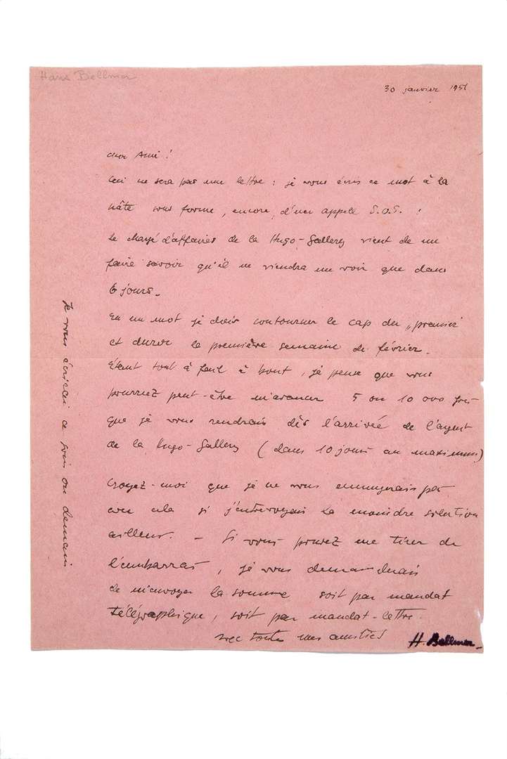 L.A.S. « H. Bellmer », 30 janvier 1951 à un ami | 1 page in-4 sur papier rose.