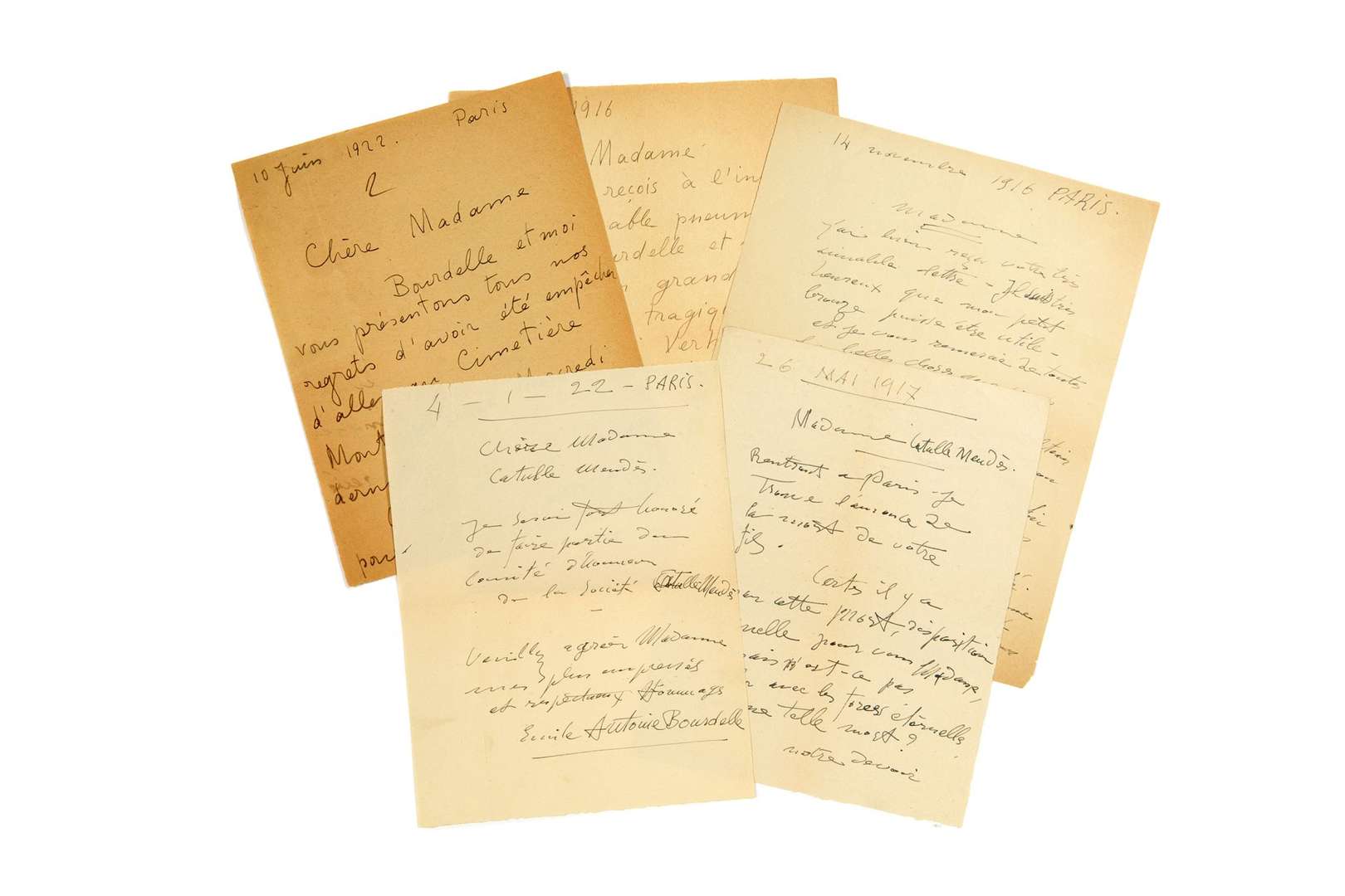 28 nov. 1916, avec post-scriptum a.s. de Bourdelle évoquant la mort tragique de leur ami VERHAEREN. 10 juin 1922, ne pouvant assister à la cérémonie au cimetière Montparnasse.