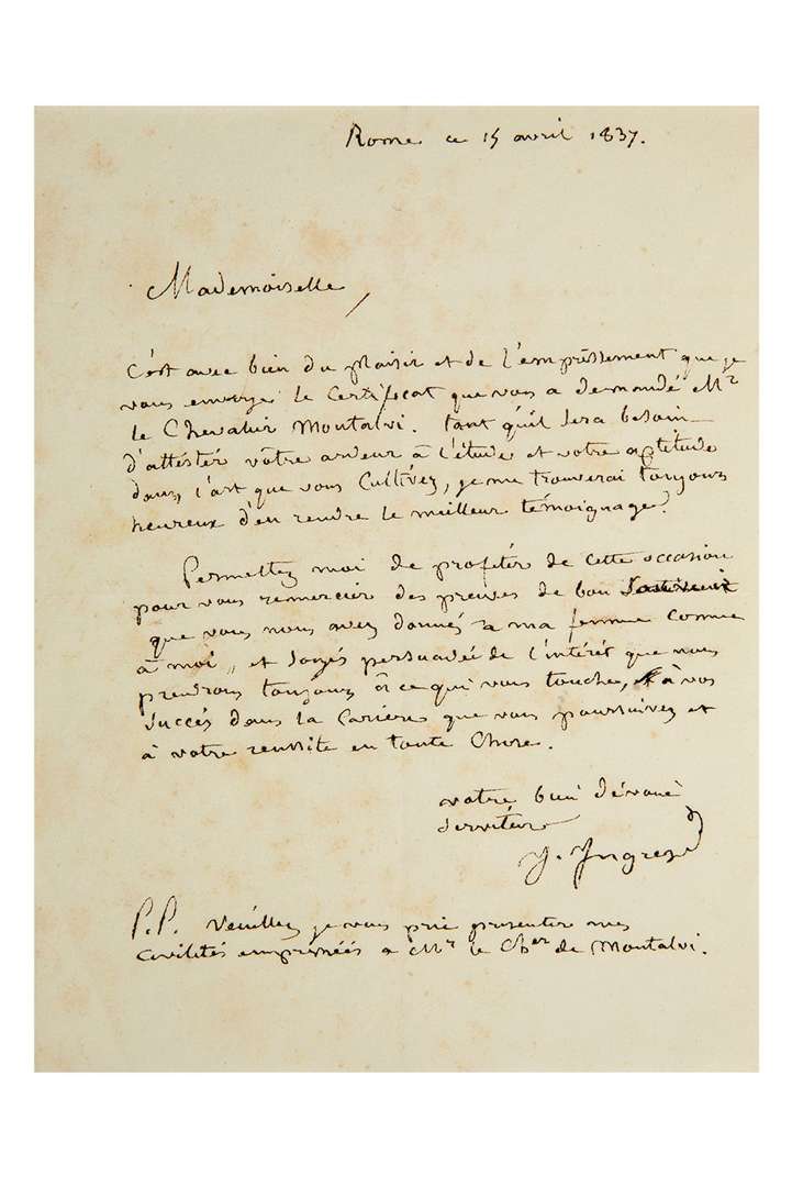 L.A.S. « J. Ingres », Rome 15 avril 1837, à une demoiselle | 1 page petit in-4.
