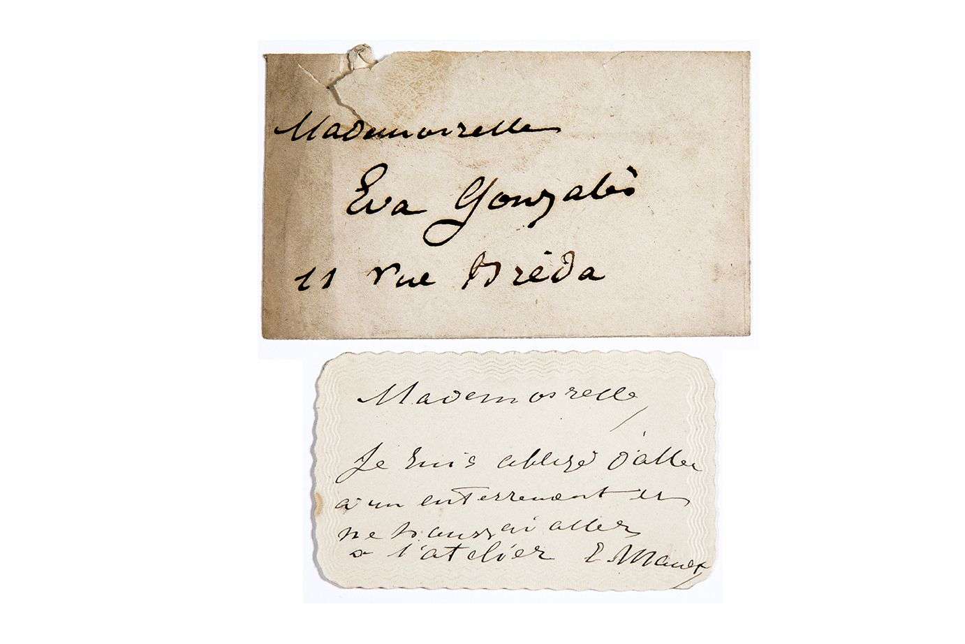L.A.S. « E. Manet », à Mlle Éva GONZALÈS | 1 page oblong in-24, enveloppe.