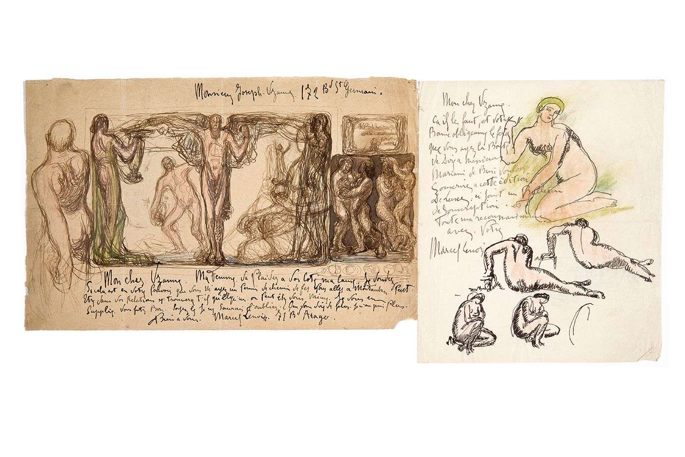 En marge de 5 études de femmes nues, il prie Uzanne d'obtenir des Messieurs Mariani la souscription à une édition de luxe.Sous une grande composition représentant un groupe de personnages entourant une figure ailée, il prie Uzanne de lui obtenir un permis de chemin de fer pour aller à Montauban. Au verso, grand cartouche à la plume avec une femme assise, et brouillon de texte : « Ce masque d'enfant supporté par des mains pieuses reliées par la ferveur, n'est-il pas l'image de la résignation »...