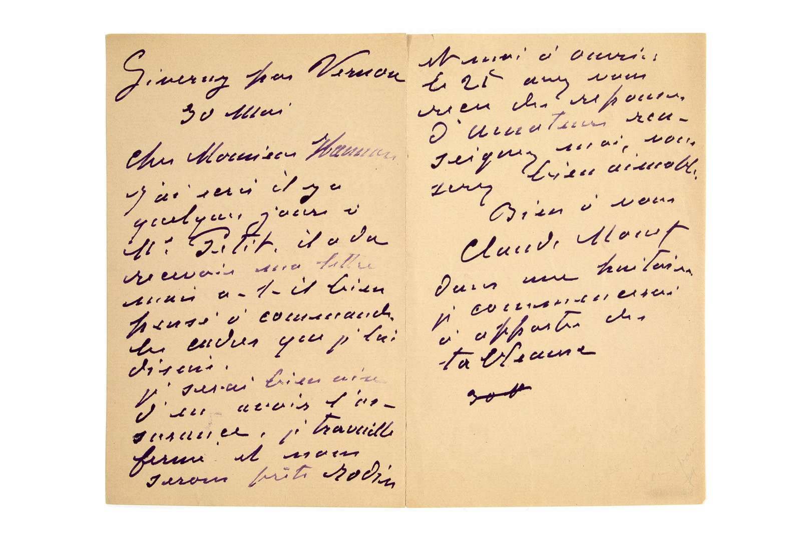 L.A.S. « Claude Monet », Giverny 3 mai [1889], à M. Hannon | 2 pages in-8 à l'encre violette.
