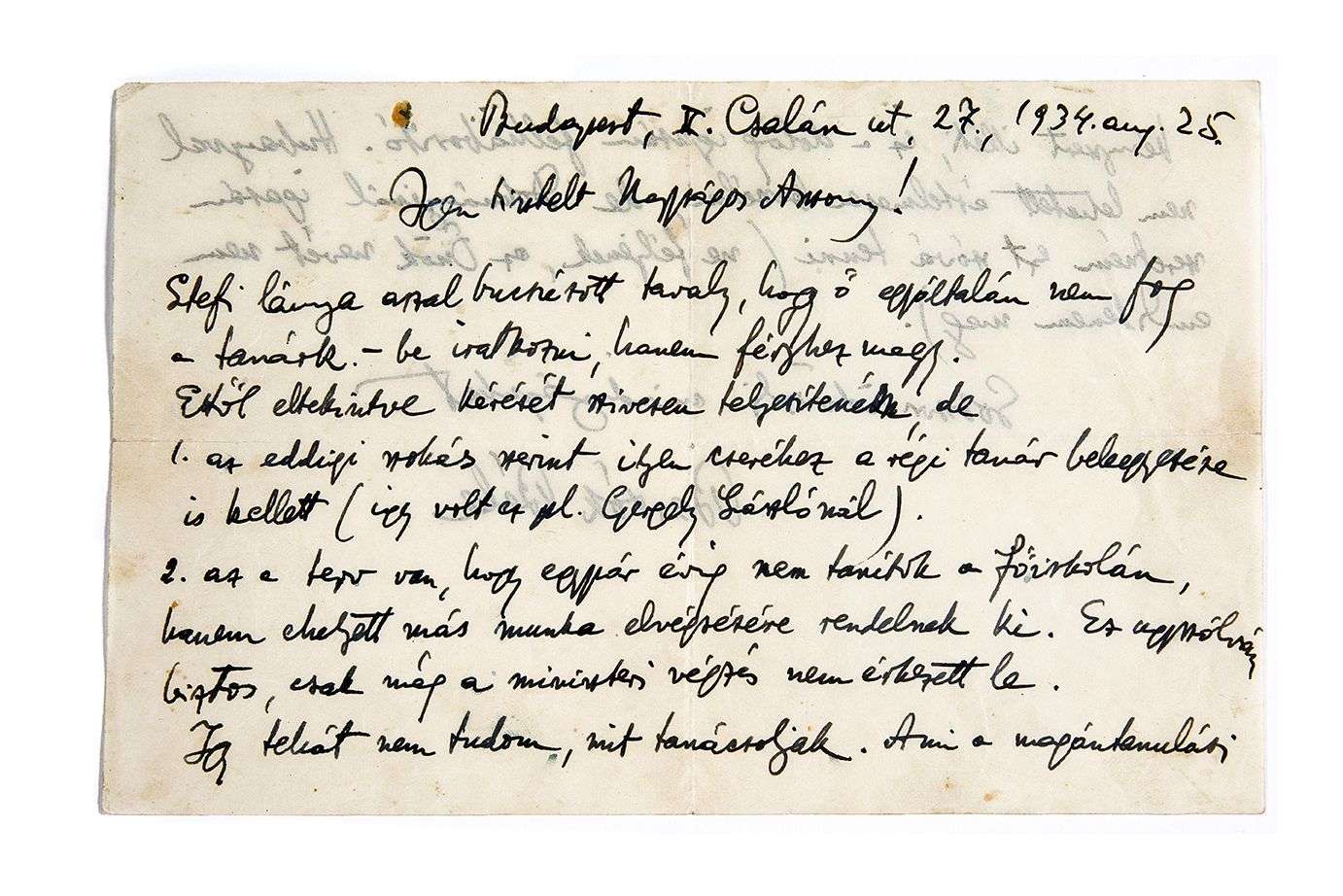 L.A.S. « Bartók Béla », Budapest 25 août 1934, à Mme Stefánia