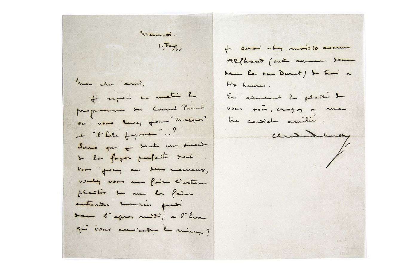 Masques et l'Isle Joyeuse ? Sans que je doute une seconde de la façon parfaite dont vous jouez ces deux morceaux, voulez-vous me faire l'extrême plaisir de me les faire entendre demain jeudi dans l'après-midi, à l'heure qui vous conviendra le mieux ? Je serai chez moi : 10 avenue Alphand (cette avenue donne dans la rue Duret) de trois à six heures »...