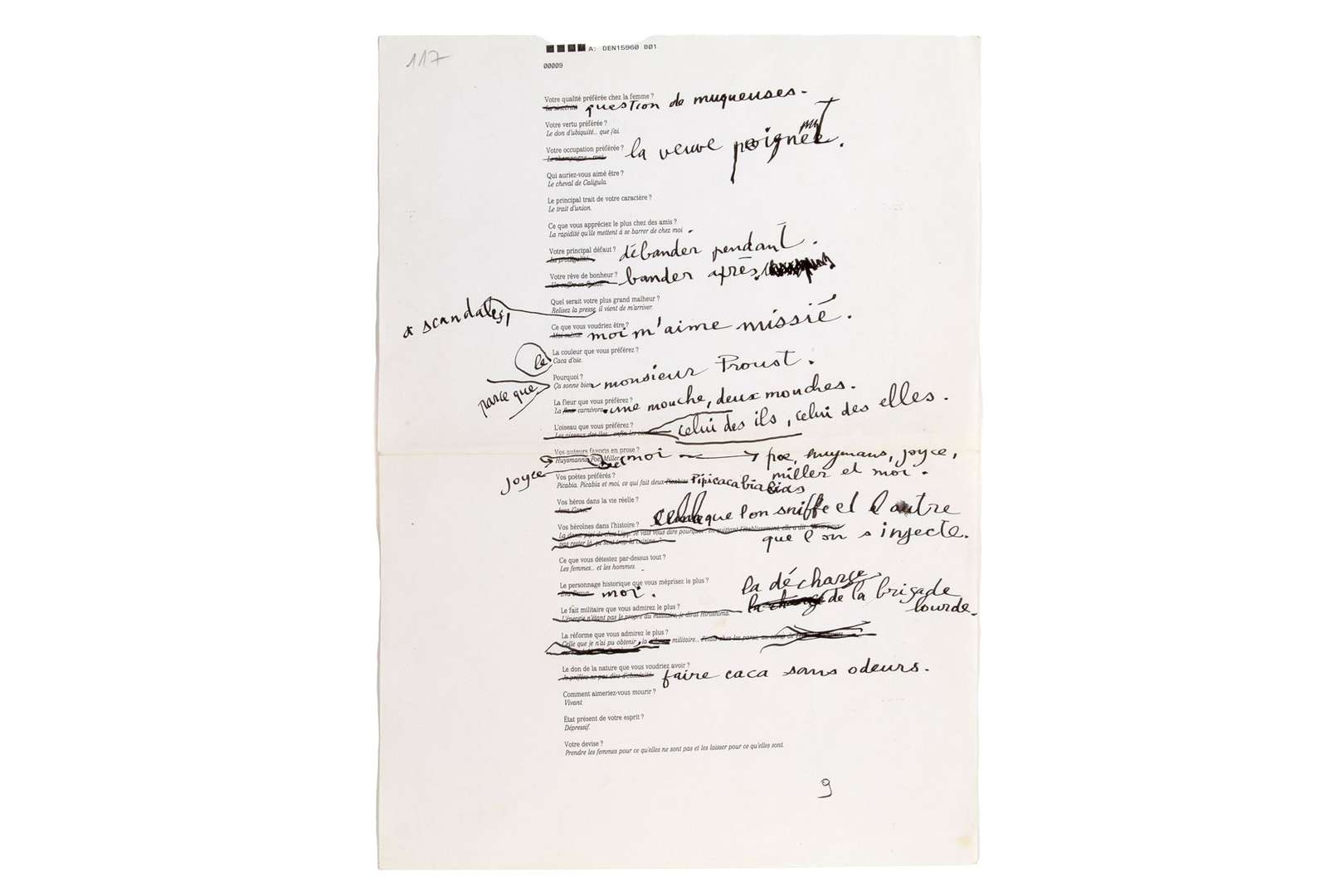 Plusieurs réponses autographes témoignent de son goût de la provocation. Ainsi, à la question sur la qualité préférée chez la femme, il biffe la réponse imprimée (La sincérité) pour écrire : « question de muqueuses » | concernant l'occupation préférée, il écrit : « la veuve poignet » |quant aux héroïnes dans l'histoire : « celle que l'on sniffe et l'autre qu'on s'injecte » | quant au don de la nature qu'on voudrait avoir, il biffe la réponse imprimée (Je préfère ne pas dire d'obscénité) pour écrire : « faire caca sans odeurs ».