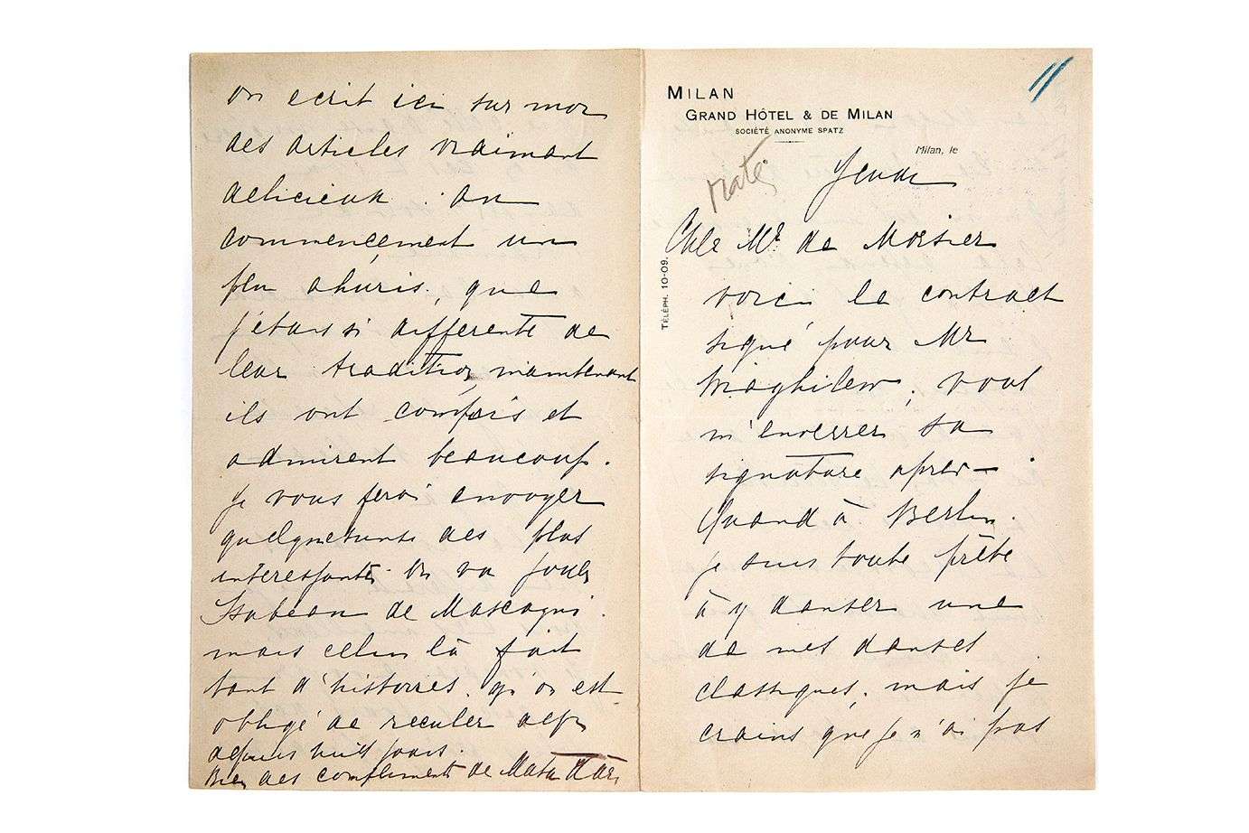 L.A.S. « Mata Hari », Milan Jeudi, à M. de MORTIER | 4 pages in-8, en-tête Grand Hôtel & de Milan.