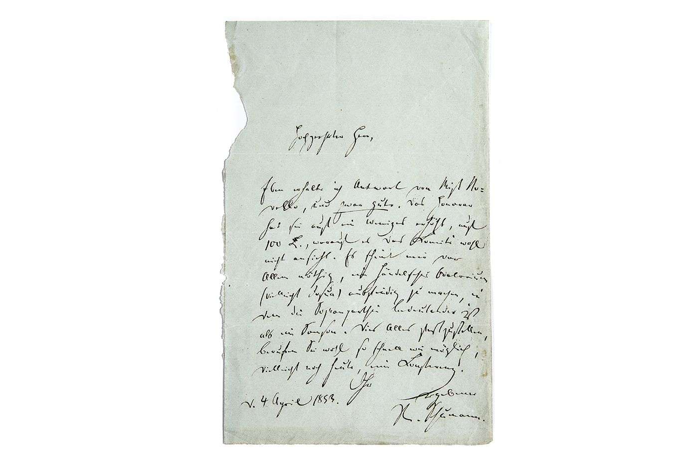 L.A.S. « R. Schumann », [Düsseldorf] 4 avril 1853, [à Vincent NOVELLO ?] | 1 page in-8 (bord gauche inégalement coupé) | en allemand.