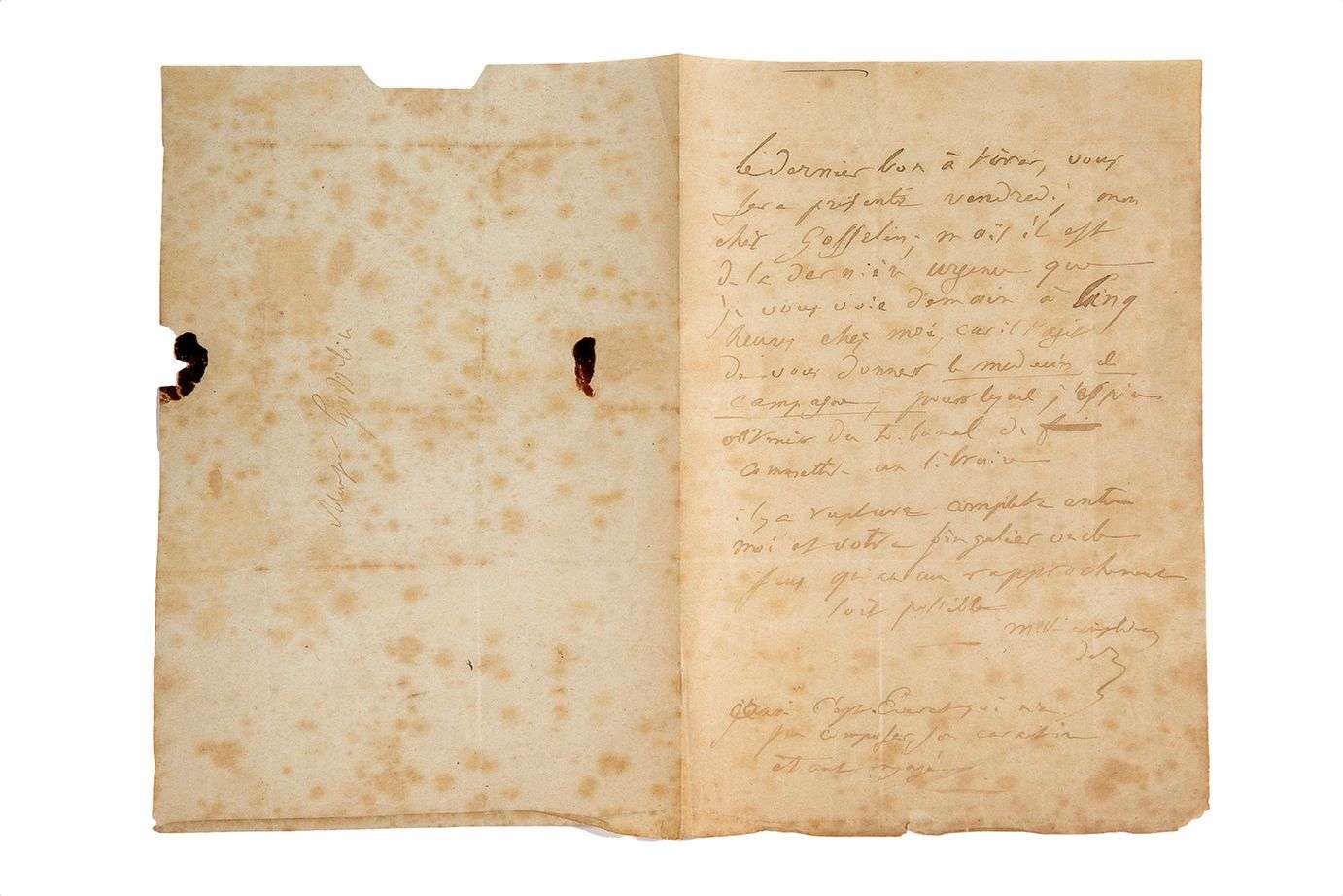 « Le dernier bon à tirer [du second dixain des Contes drolatiques] vous sera présenté vendredi, mon cher Gosselin | mais il est de la dernière urgence que je vous voie demain à cinq heures chez moi, car il s'agit de vous donner le Médecin de campagne, pour lequel j'espère obtenir du tribunal de commettre un libraire. Il y a rupture complète entre moi et votre singulier oncle [Louis MAME] sans qu'aucun rapprochement soit possible. [...] C'est Éverat qui n'a pu composer, son caractère étant engagé ».