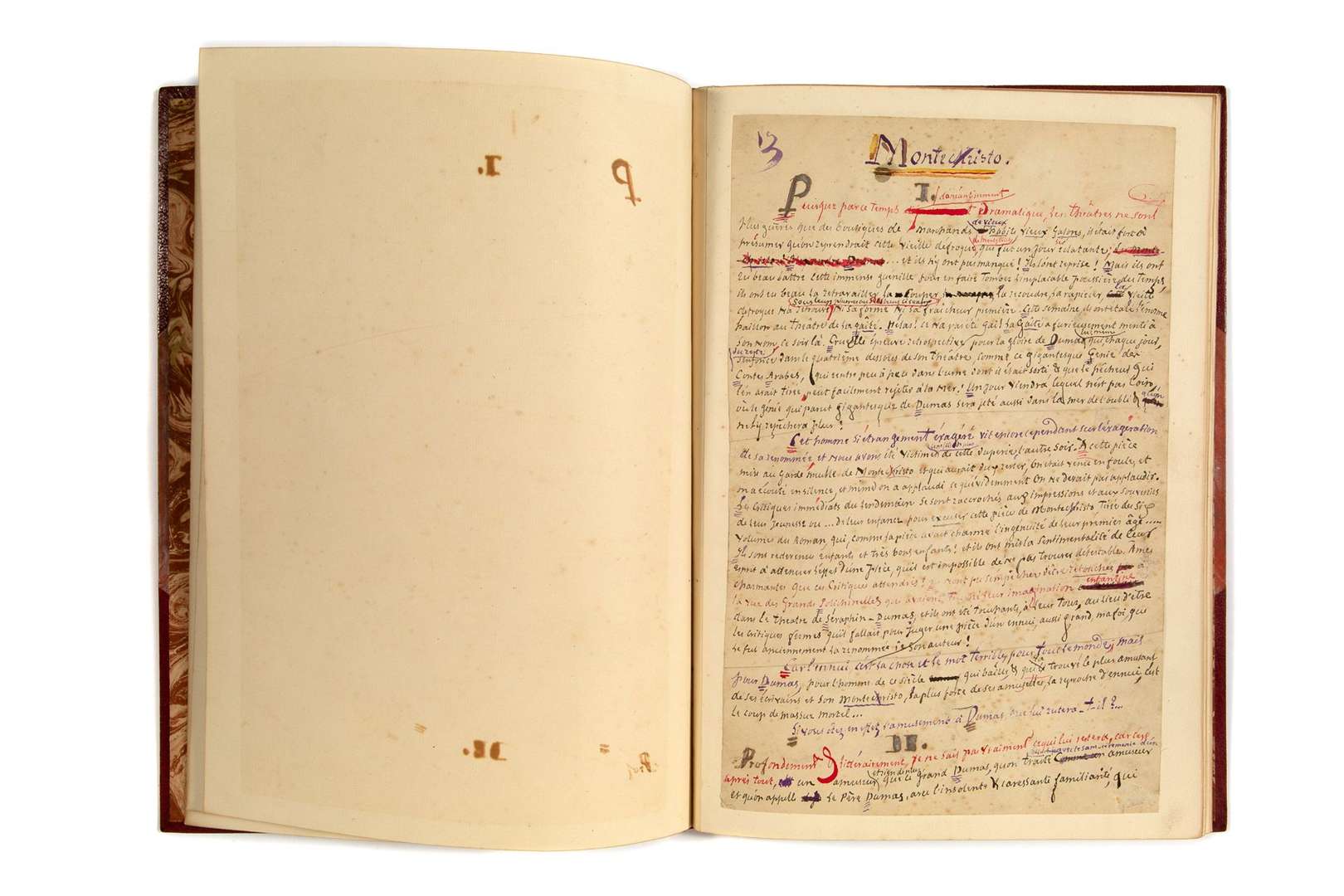 Superbe manuscrit aux encres noire, violette, rouge et argent, avec de nombreuses ratures et corrections, et des additions interlinéaires. Il a été découpé pour l'impression puis remonté.