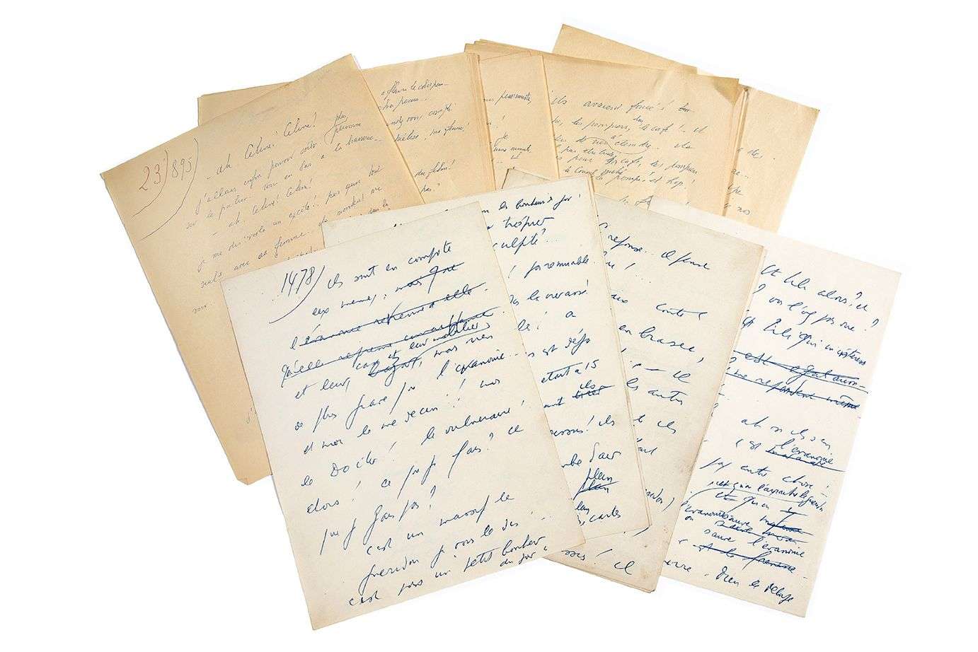 La séquence est numérotée 23 au stylo rouge. Le manuscrit est rédigé au stylo-bille bleu au recto de feuillets de papier filigrané