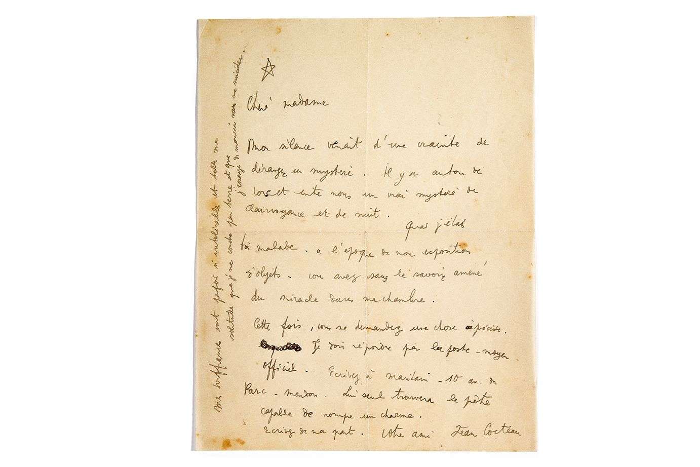 « Mon silence venait d'une crainte de déranger un mystère. Il y a autour de vous et entre nous un vrai mystère de clairvoyance et de nuit. Quand j'étais très malade, à l'époque de mon exposition d'objets [Poésie plastique], vous avez sans le savoir amené du miracle dans ma chambre. Cette fois, vous me demandez une chose précise ». Il conseille d'écrire à Jacques MARITAIN à Meudon : « Lui seul trouvera le prêtre capable de rompre un charme. [...] Mes souffrances sont parfois si intolérables et telle ma solitude que je me couche par terre et que j'essaye de mourir sans me suicider ».