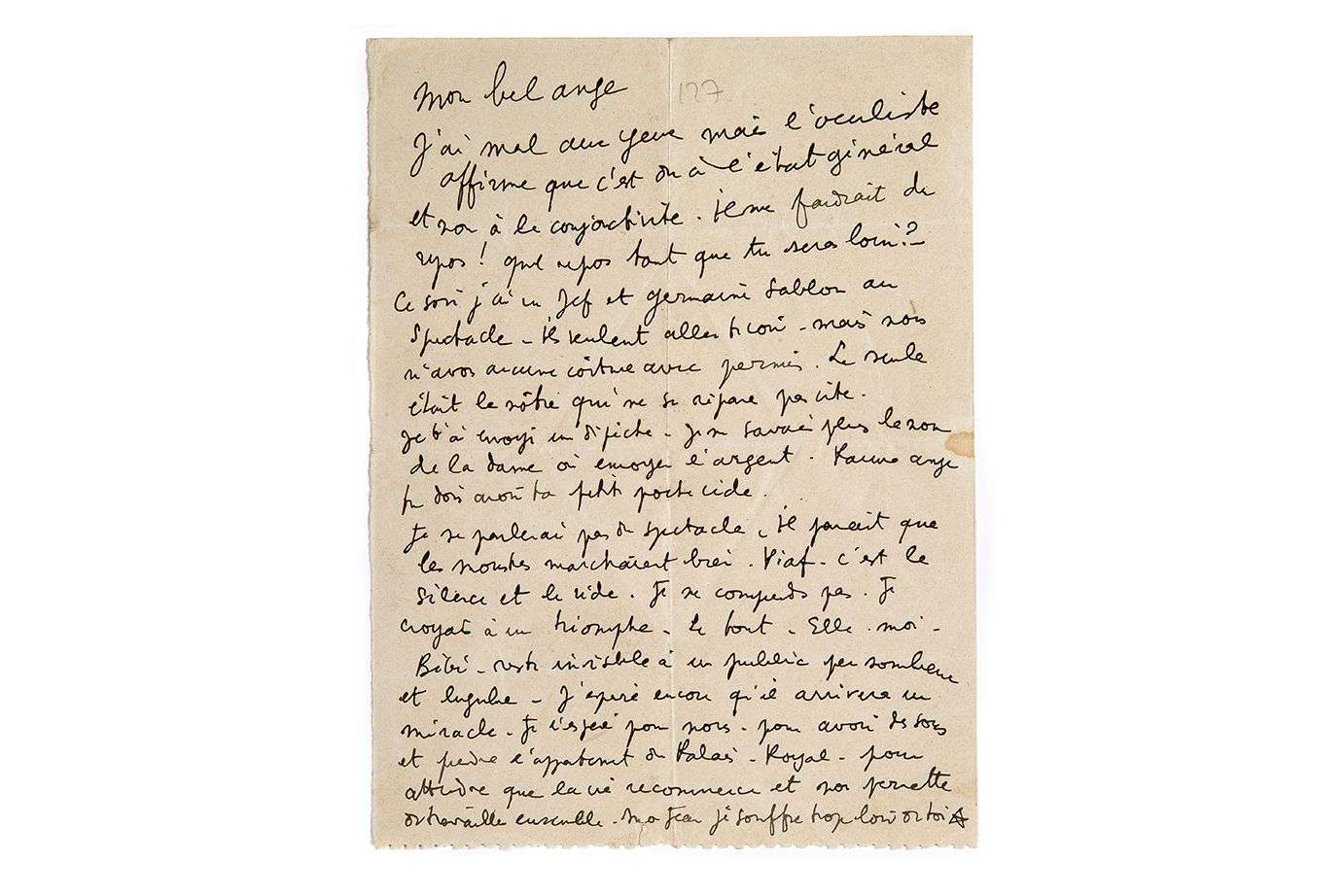J'espère encore qu'il arrivera un miracle. Je l'espère pour nous pour avoir des sous et prendre l'appartement du Palais-Royal - pour attendre que la vie recommence et nous permette de travailler ensemble. Mon Jean je souffre trop loin de toi ».