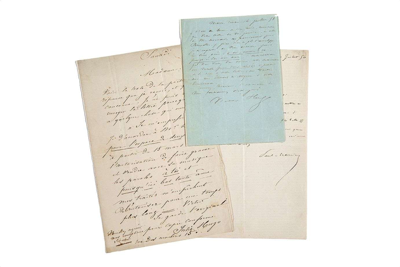 Hugo accordant à Ernest Doré pour deux ans « l'autorisation de faire graver et vendre avec sa musique les paroles À toi et Puisqu'ici bas toute âme » (1 p. in-8). - Paul MEURICE (Paul), Paris 11 juillet 1856, à Ernest Doré, lui transmettant l'autorisation de Victor Hugo de mettre en musique La Prière pour tous : « Si sa musique vaut la peinture de son frère, elle est bien belle » (½ p. in-8, enveloppe).