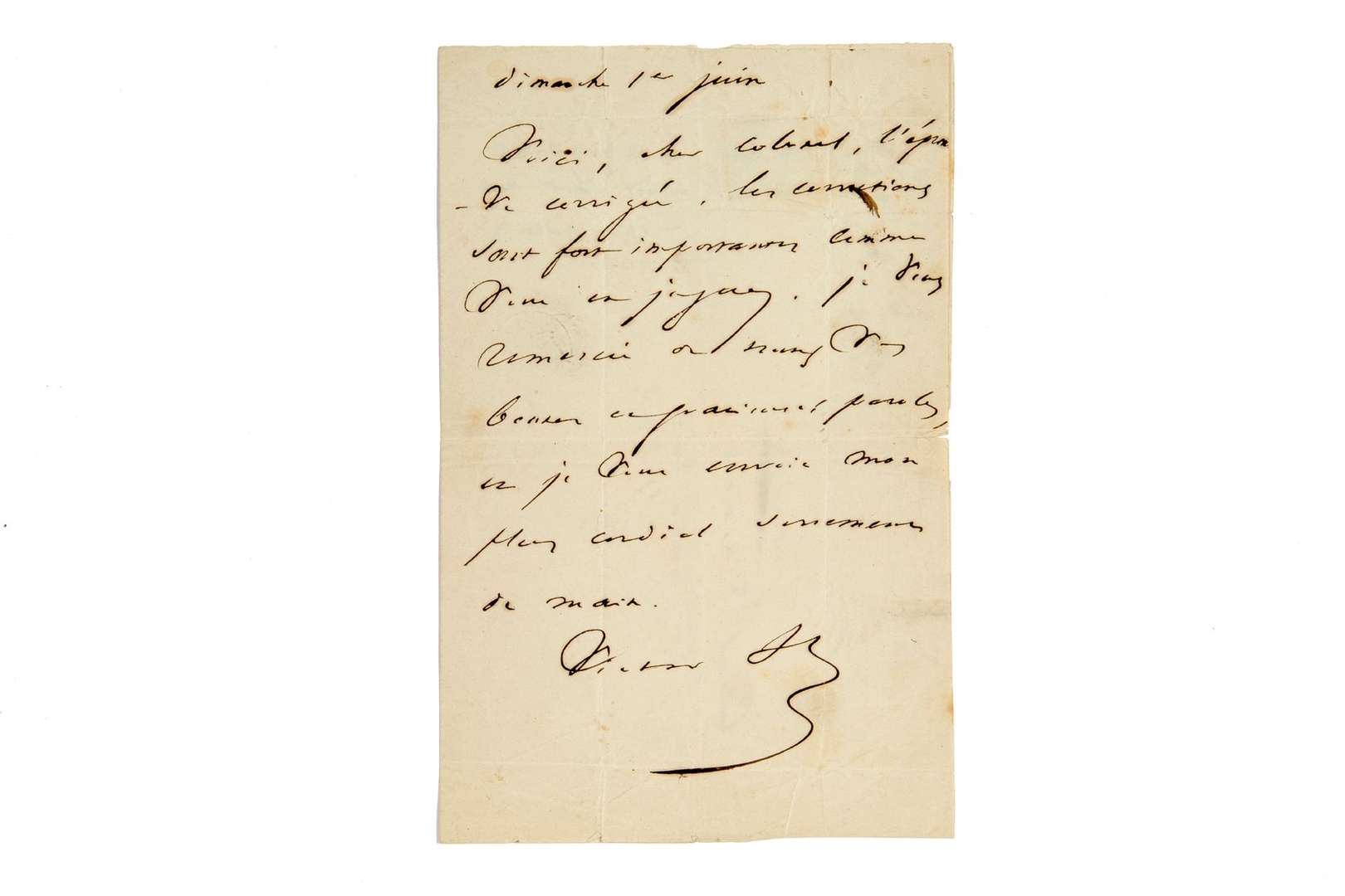 « Voici, cher colonel, l'épreuve corrigée. Les corrections sont fort importantes comme vous en jugerez. Je vous remercie de toutes vos bonnes et gracieuses paroles »... [Il s'agit de l'adresse À l'Italie, rédigée à la demande de Mazzini. Le comte Luigi PIANCIANI (1810-1890) était un patriote italien | après avoir participé à la défense de Venise comme colonel, il avait dû s'exiler | il s'installa à Jersey, et faisait partie du cercle des proscrits autour de Victor Hugo | administrateur du journal républicain