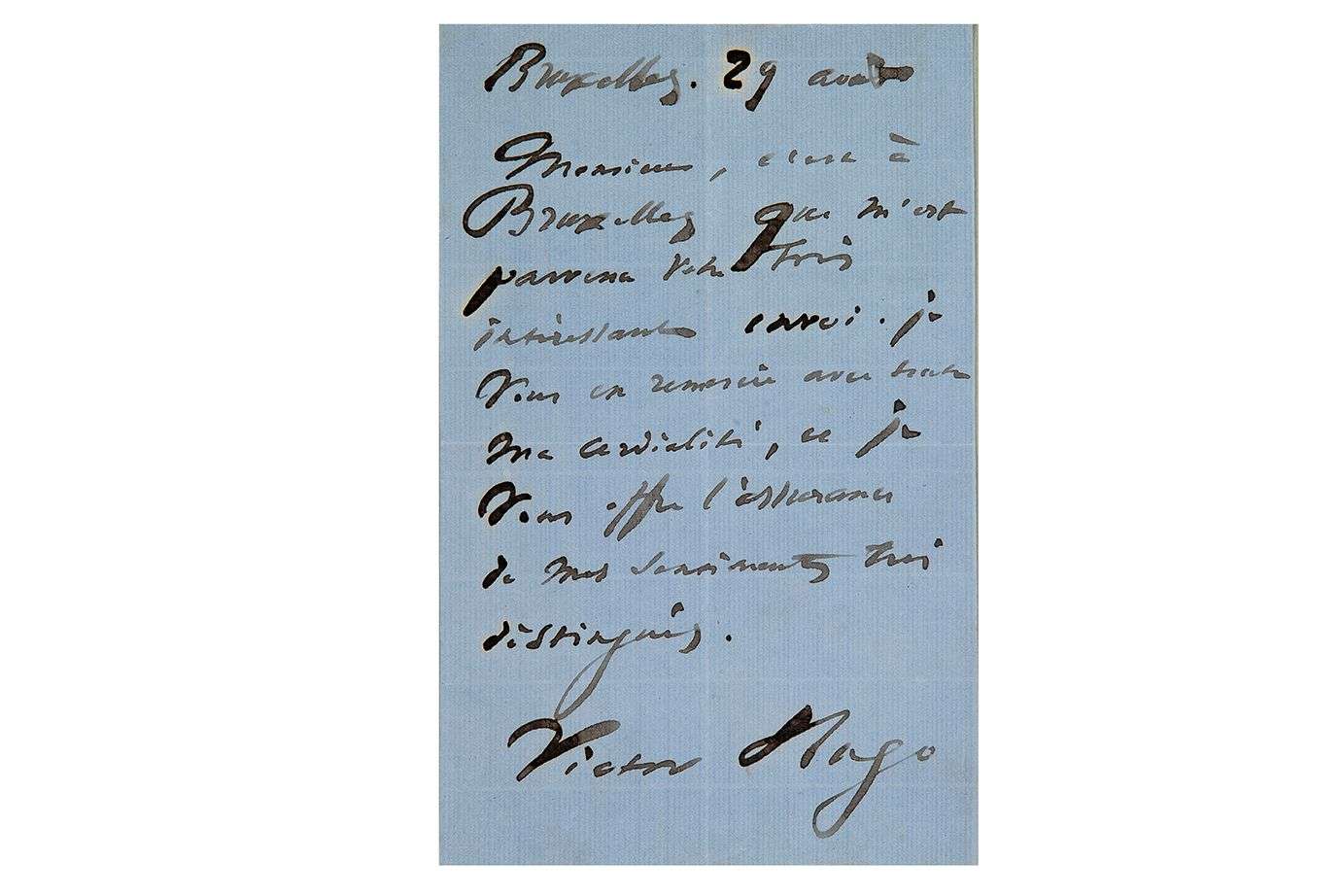 L.A.S. « Victor Hugo », Bruxelles 29 août [1869], à William H. Mason à Arundel (Sussex) | 1 page in-8 sur papier bleu, enveloppe timbrée.