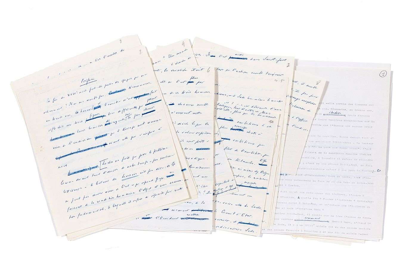 On joint aussi 7 notes de travail autographes (in-16 ou in-12), dont nous citerons la plus développée : « Le départ de la préface au Triangle Noir est sans doute : une civilisation qui ne veut pas survivre comme civilisation est condamnée à mort. Goya et Laclos comme témoins, Saint-Just comme tentative désespérée (de quoi ?) ». Plus 2 petits béquets autographes écartés du manuscrit, sur Sade et sur la Raison.